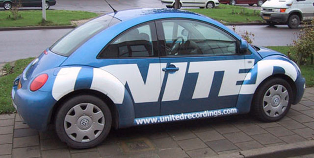 ![]() Hey drivers & designer, here my carlettering contribution: The new Beetle by VW is not the most convenient car for lettering, cause of the overall round shapes. the company that did this stickering supposedly had 3D-computer models of most brands of cars. also the new beetle was in their archive. i wanted the UNITED lettering to be all over, front to back, so that seemed easy. nonetheless they had to cut up the stickers many times to make a perfect fit. grz, donald [DBXL] ![]()